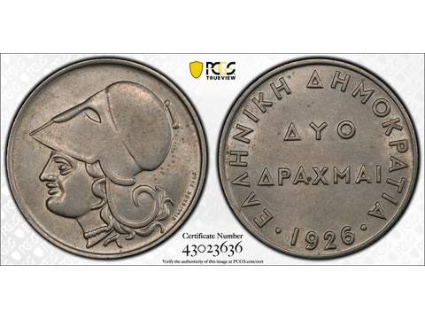 Grekland 2 drachmai 1926, PCGS AU58
