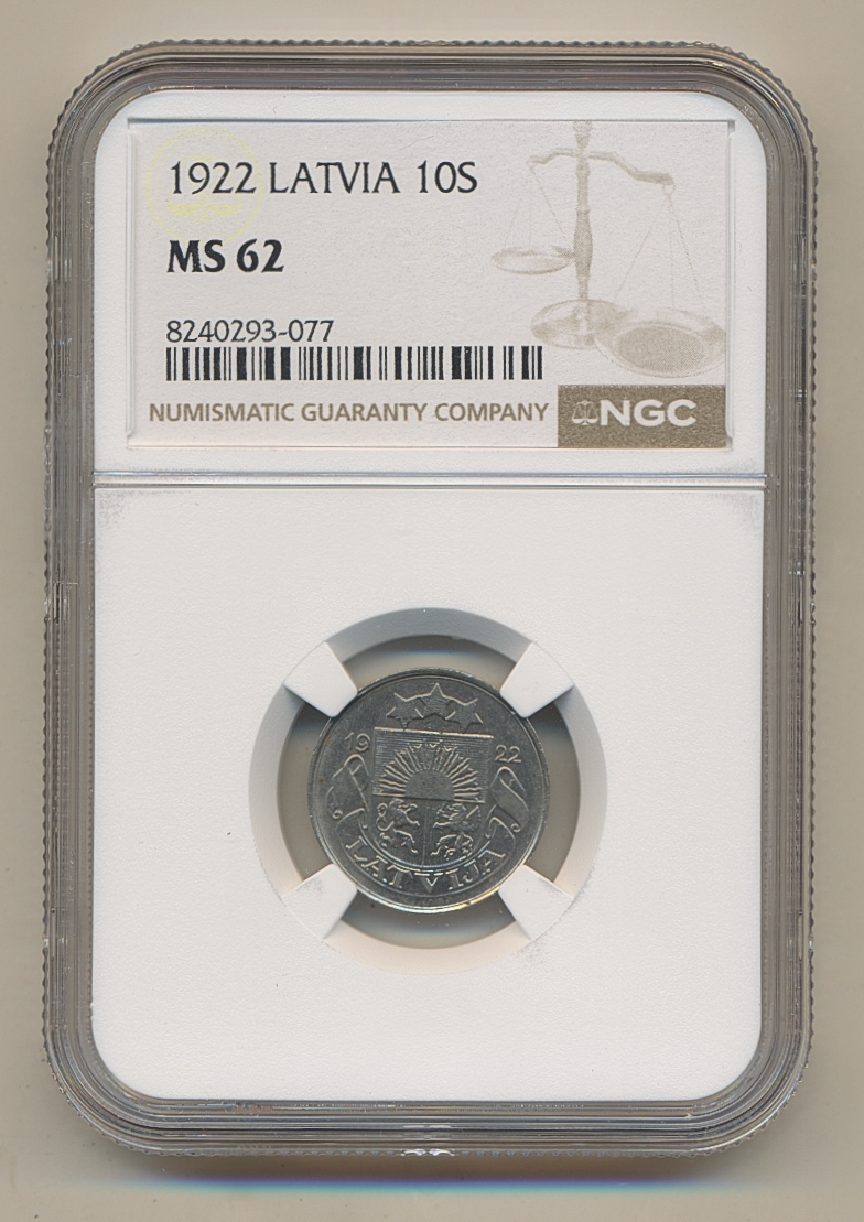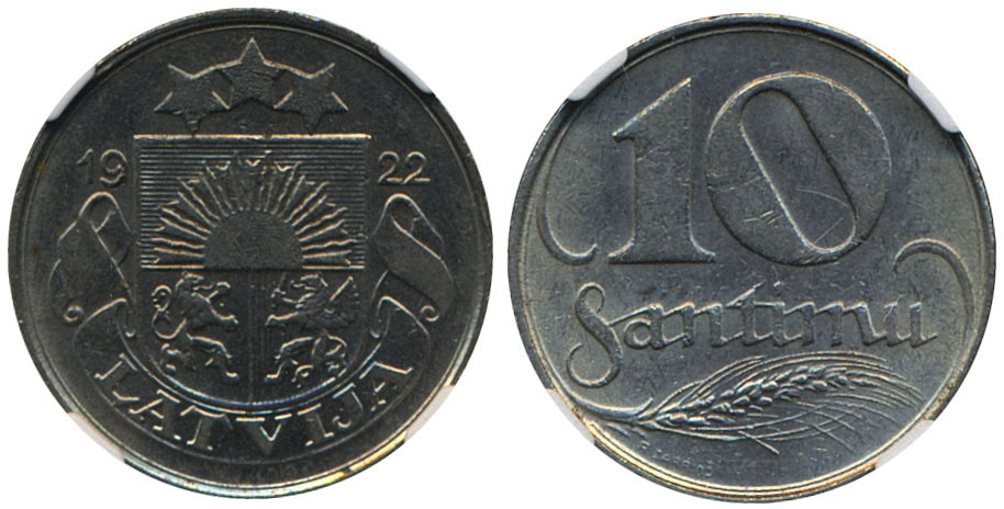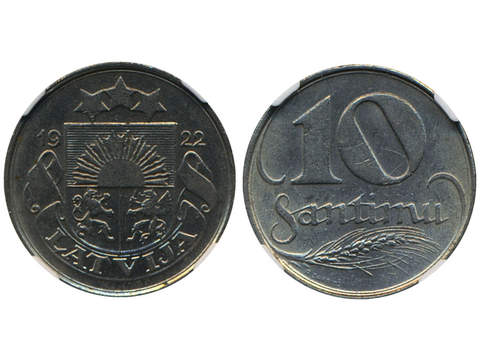 Coins, Latvia. KM 4, 10 santimi 1922. Graded by NGC as MS62. XF-UNC.