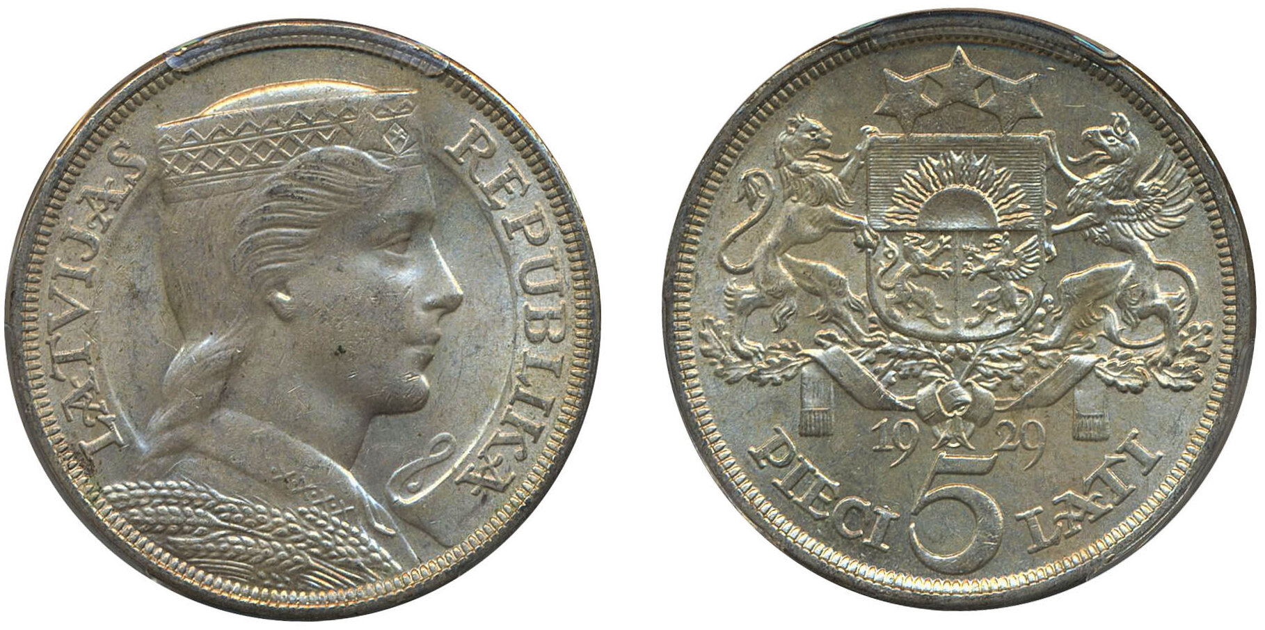Coins, Latvia. KM 9, 5 lati 1929. Graded by PCGS as MS62. XF-UNC.