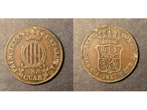 Spanien - Barcelona 3 cuartos 1837, VF-XF, litet ärg