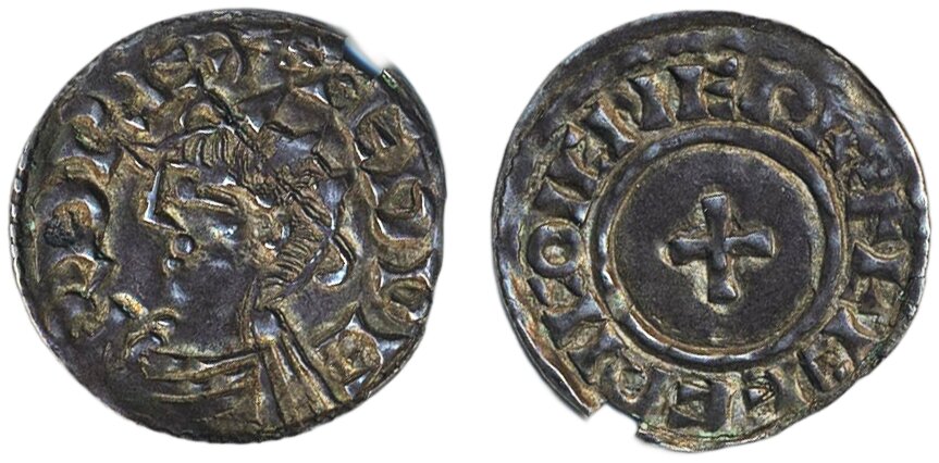 Coins, Great Britain. Edward the Confessor, Spink 1173, 1 penny ND. 0.77 g. Warwick mint. Eicefric, moneyer. Radiate head with short cross reverse. Minor edge loss. North 816. VF-XF.