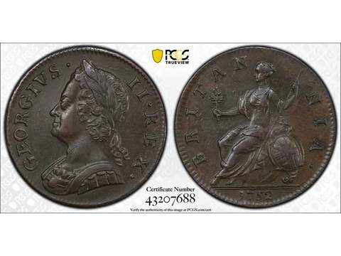 Storbritannien George II (1727-1760) 1/2 penny 1752, AU+, PCGS AU58