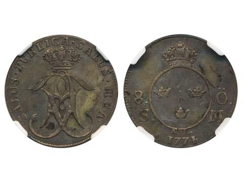 Coins, Sweden. Adolf Fredrik, SM 79a, 8 öre 1771. Vacker toning. Ex. Eric Newman. I NGC-kassett graderad MS61. 01.