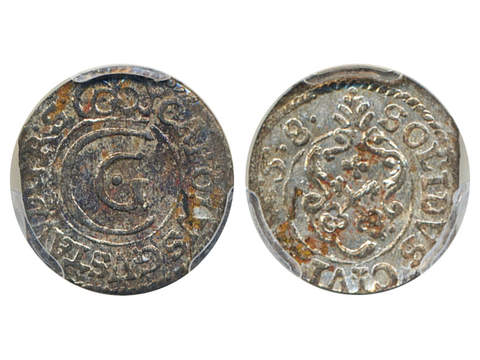 Coins, Swedish possessions, Riga. Karl X Gustav, SB 82, 1 solidus 1658. Graded by PCGS as MS61. SMB 141. 01.
