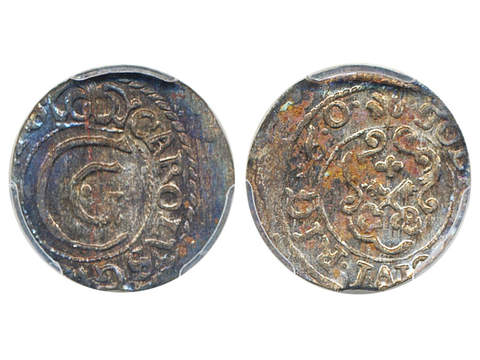 Coins, Swedish possessions, Riga. Karl X Gustav, SB 84, 1 solidus 1660. Graded by PCGS as MS61. Beautifully toned. SMB 143. 01.