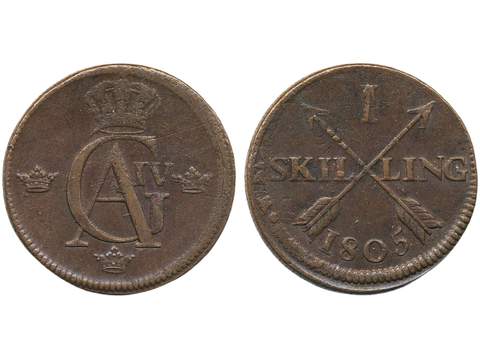 Coins, Sweden. Gustav IV Adolf, SM 48, 1 skilling 1805. 27.62 g. Avesta. 1+.