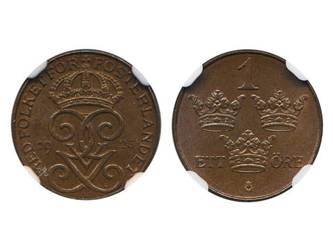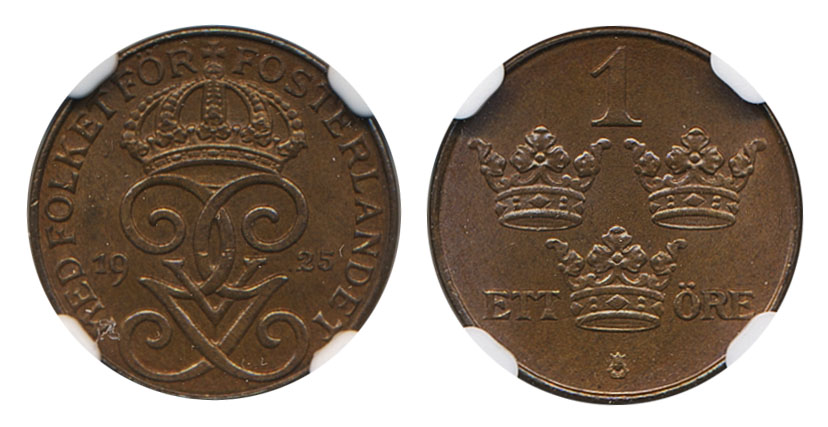 Coins, Sweden. Gustav V, MIS I.15, 1 öre 1925. Graded by NGC as MS65 BN. 0.