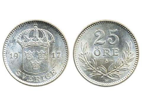Coins, Sweden. Gustav V, MIS I.5, 25 öre 1917. 01/0.