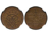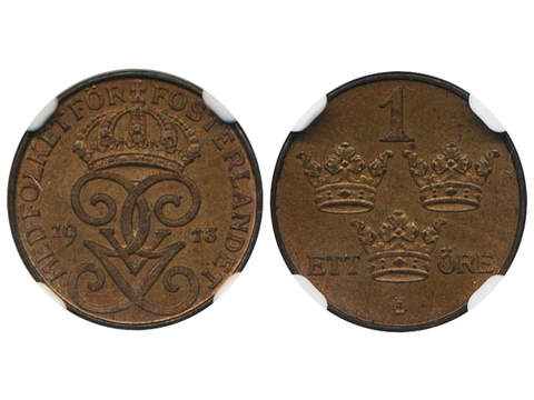Coins, Sweden. Gustav V, MIS I.5c, 1 öre 1913. Graded by NGC as MS64 BN. 01/0.