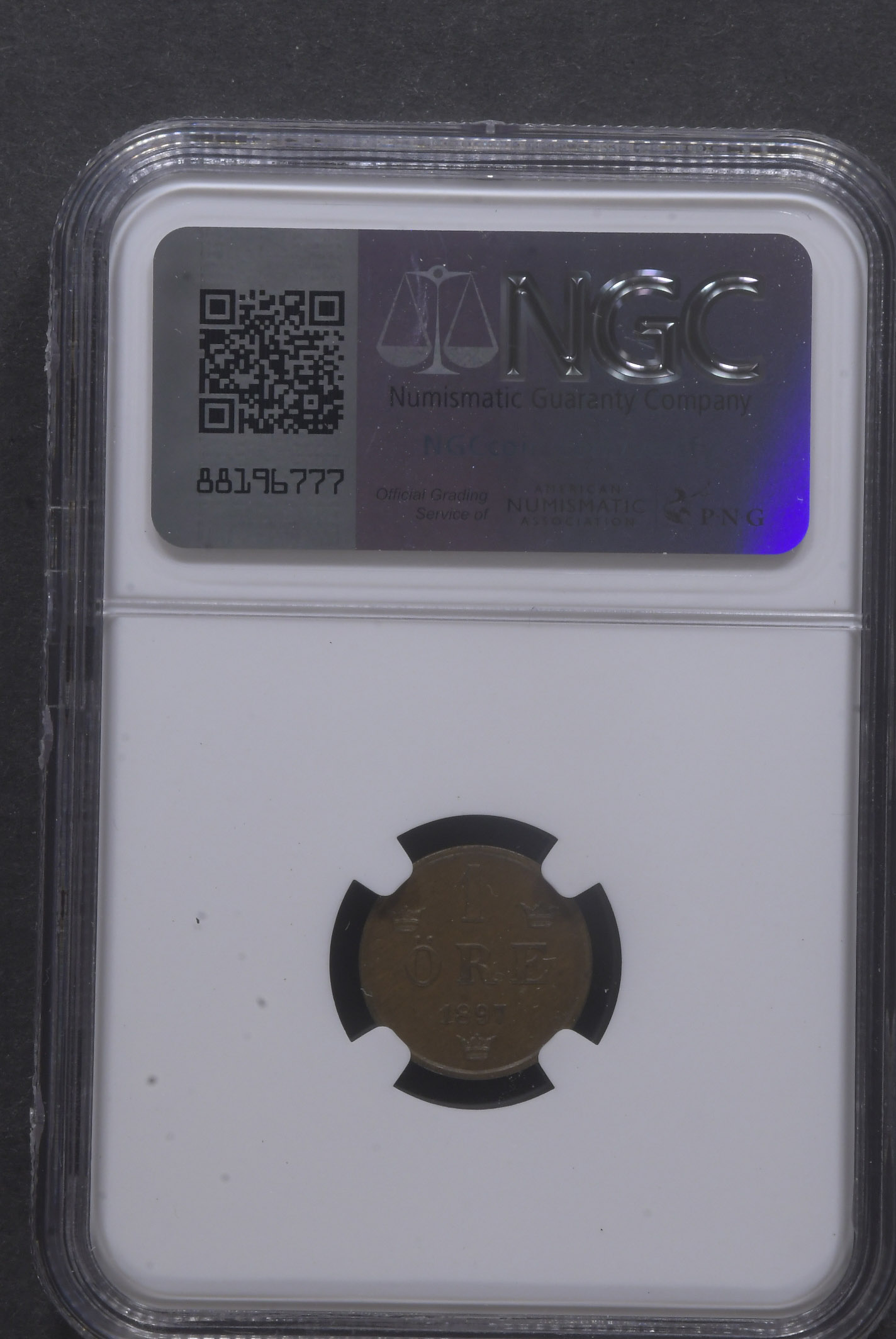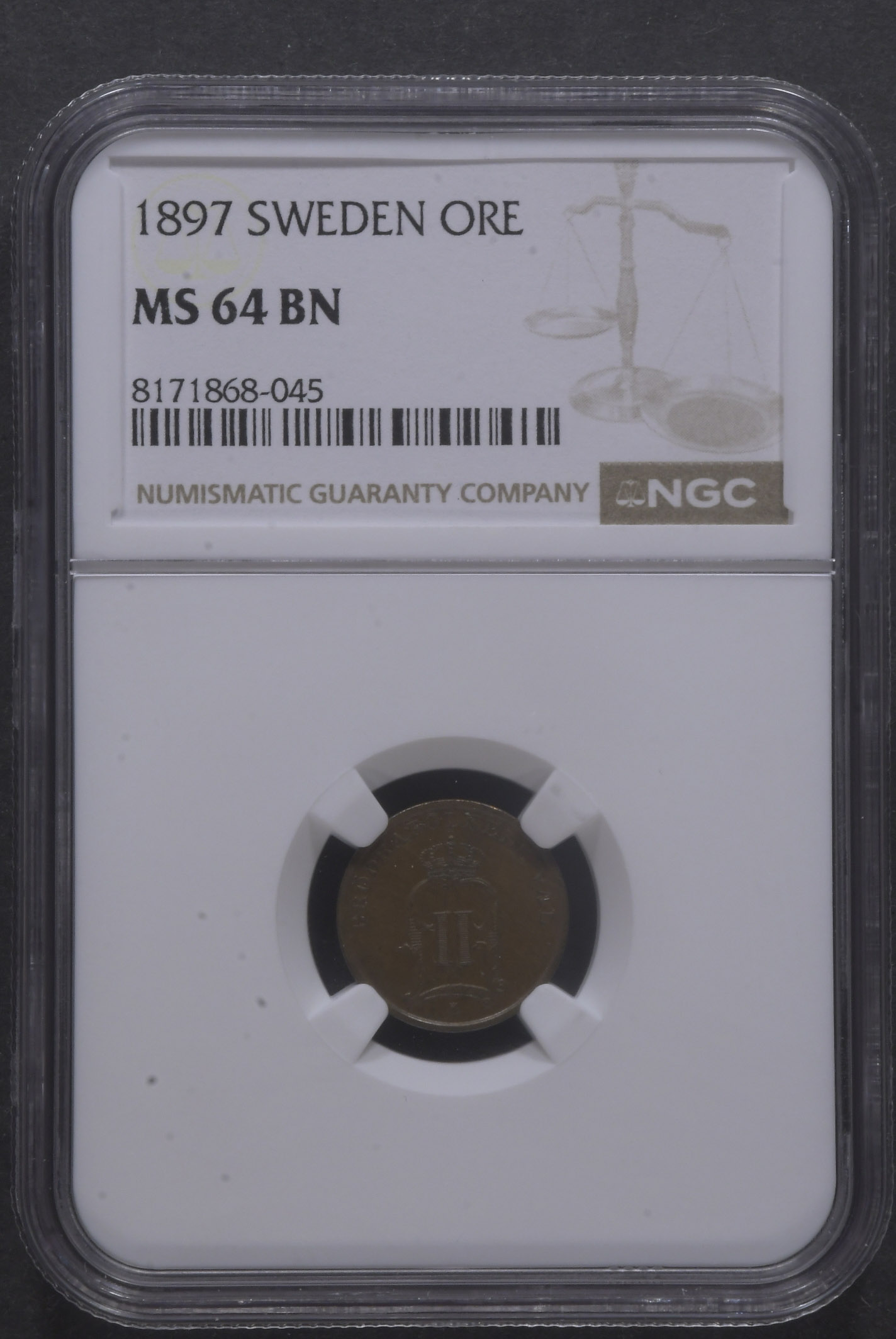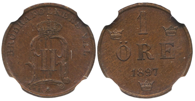 Coins, Sweden. Oskar II, MIS III.22, 1 öre 1897. Graded by NGC as MS64 BN. 01/0.