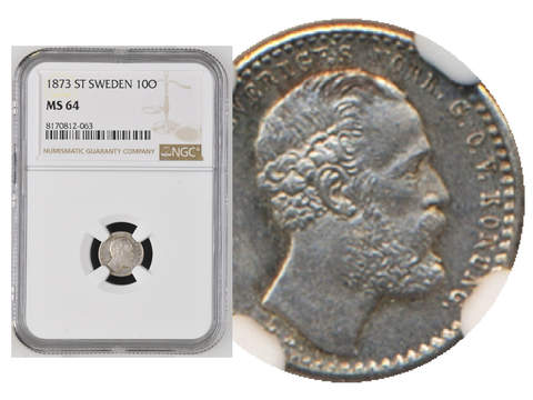 Coins, Sweden. Oskar II, SM 43a, 10 öre 1873. Graded by NGC as MS64. MIS 2a. 01/0.