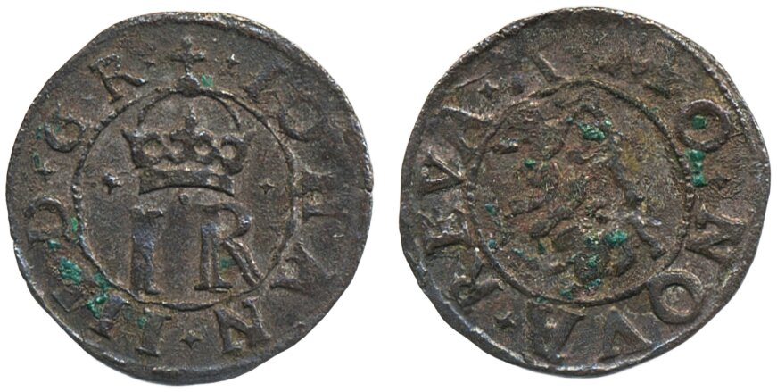 Coins, Swedish possessions, Reval. Johan III, SB 43b, 1 solidus ND. 1.00 g. Attractive example with lustre, some verdigris. SMB 184. 1+/01.