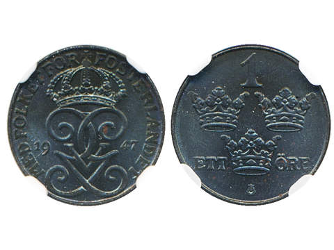 Coins, Sweden. Gustav V, MIS II.10, 1 öre 1947. Graded by NGC as MS64. 01/0.
