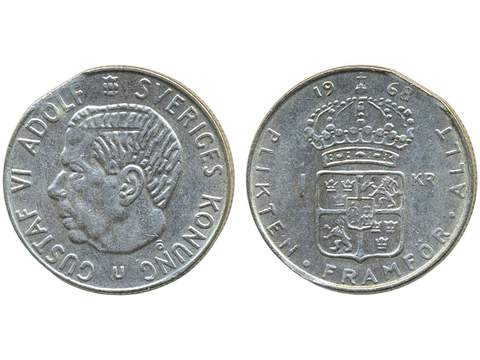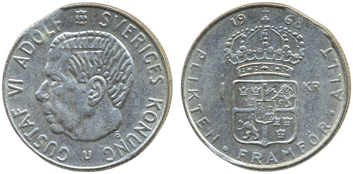 Coins, Sweden. Gustav VI Adolf, MIS I.18, 1 krona 1968. Mint error, edge clip from …