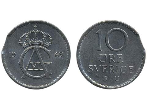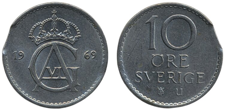 Coins, Sweden. Gustav VI Adolf, MIS II.8a, 10 öre 1969. Mint error – minor edge clip. 01/0.