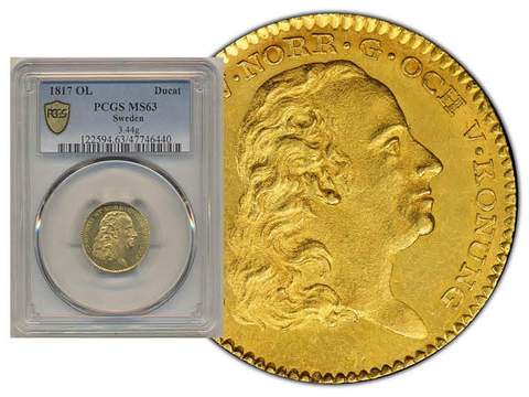 Coins, Sweden. Karl XIII, SM 9, 1 dukat 1817. Sole finest graded by PCGS as MS63. SG8. 01/0.