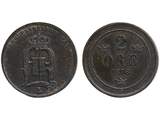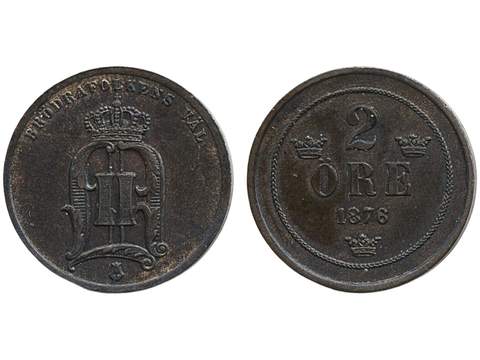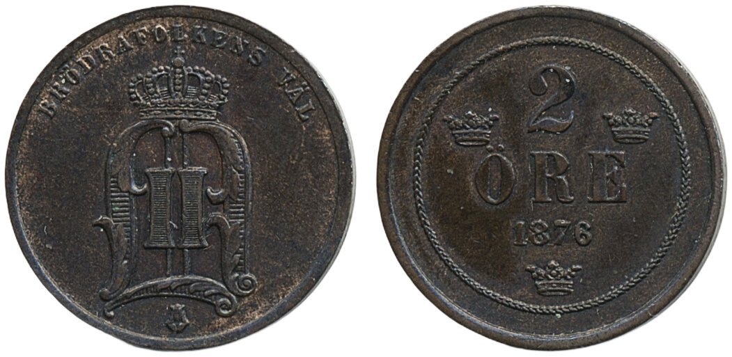 Coins, Sweden. Oskar II, MIS I.3f, 2 öre 1876. 1+/01.