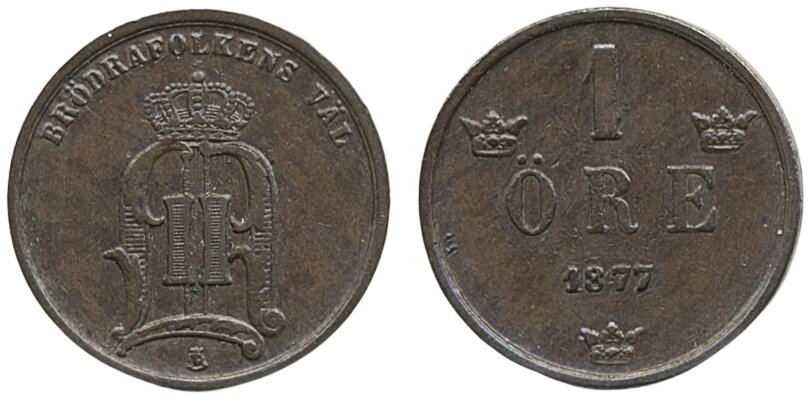 Coins, Sweden. Oskar II, MIS I.4, 1 öre 1877. 1+/01.