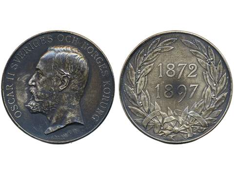 Medals, regal, Sweden. Oskar II, Silver medal to 25th Anniversary of reign, 1897. 26.85 g, 39 mm in original box. By A. Lindberg. Beautiful example, scarce with original box. 01/0.