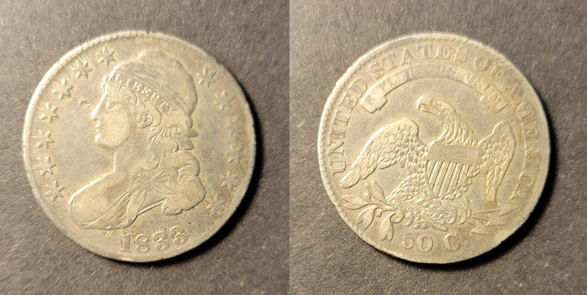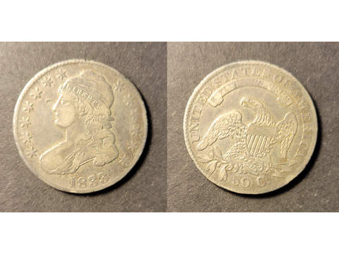 USA 50 cents 1833, F-VF repor på frånsidan Lagerantal: I lager 700 SEK Lägg i varukorgen Beskrivning Kvalitet: F-VFKatalog: KM 37 / Breen 109 (R3)Valör: 50 cents Det finns ingen beskrivning för denna produkt ännu.
