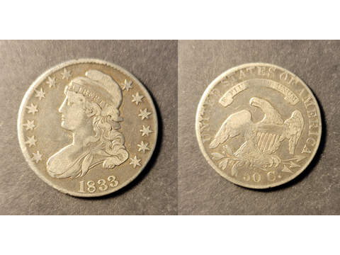 USA 50 cents 1833, VF något rengjord Lagerantal: I lager 1 400 SEK Lägg i varukorgen Beskrivning Kvalitet: VFKatalog: KM 37 / Breen 107 (R3)Valör: 50 cents Det finns ingen beskrivning för denna produkt ännu.