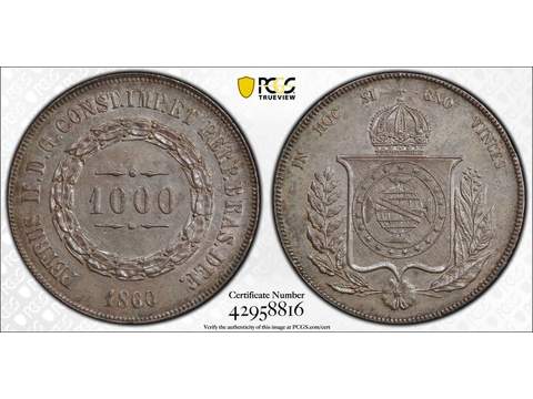 Brazil Pedro II (1831-1889) 1000 reis 1860, XF-UNC, PCGS MS62 Lagerantal: I lager 1 500 SEK Lägg i varukorgen Beskrivning Kvalitet: XF-UNCGradering: MS62Katalog: KM 465Valör: 1000 reis Det finns ingen beskrivning för denna produkt ännu.