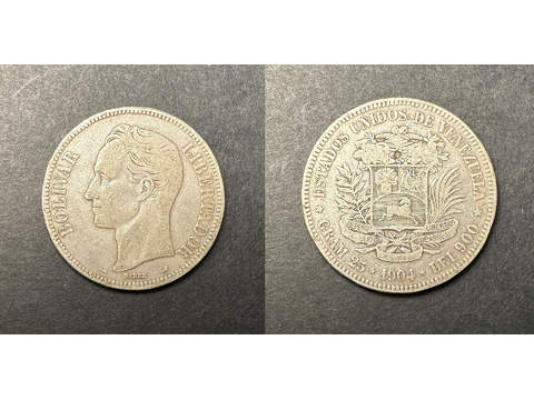 Venezuela 5 bolivares 1904, F-VF Lagerantal: I lager 800 SEK Lägg i varukorgen Beskrivning Kvalitet: F-VFKatalog: KM 24.2Valör: 5 bolivares Det finns ingen beskrivning för denna produkt ännu.