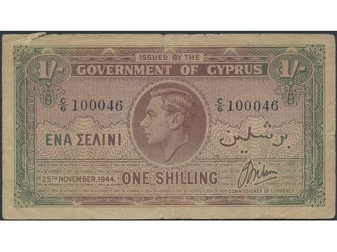 Banknotes, Cyprus. Pick 20, 1 shilling 25.11.1944. Serial number C/6 100046. VG-F.