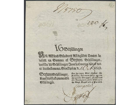 Banknotes, Sweden. SS 98, 16 skillingar 1829. No 5750. Mycket fräscht exemplar av detta …