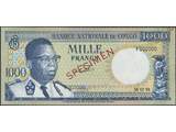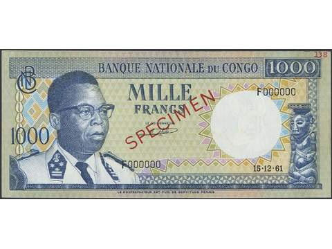 Banknotes, Zaire. Pick 8s, 1000 francs 15.12.61. F000000. Specimen with red opt. Also red numbers "138" in upper right corner. Crisp uncirculated note. UNC.