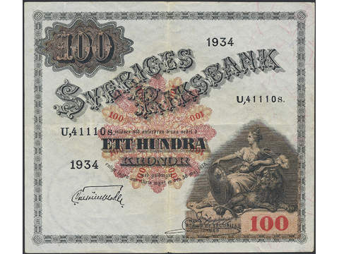 Banknotes, Sweden. SF U8:17, 100 kronor 1934. U,41110s. Problem free example of a better …