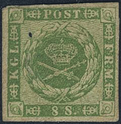 Denmark. Facit 8 (★), 1858 Imperforate. Wavy-line spandrels 8S green. Somewhat dirty, clear margins.