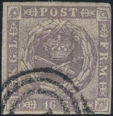 Denmark. Facit 6 used, 1857 Skilling 16S. grey-violet. One near cut margin, but not into the picture. SEK 1800