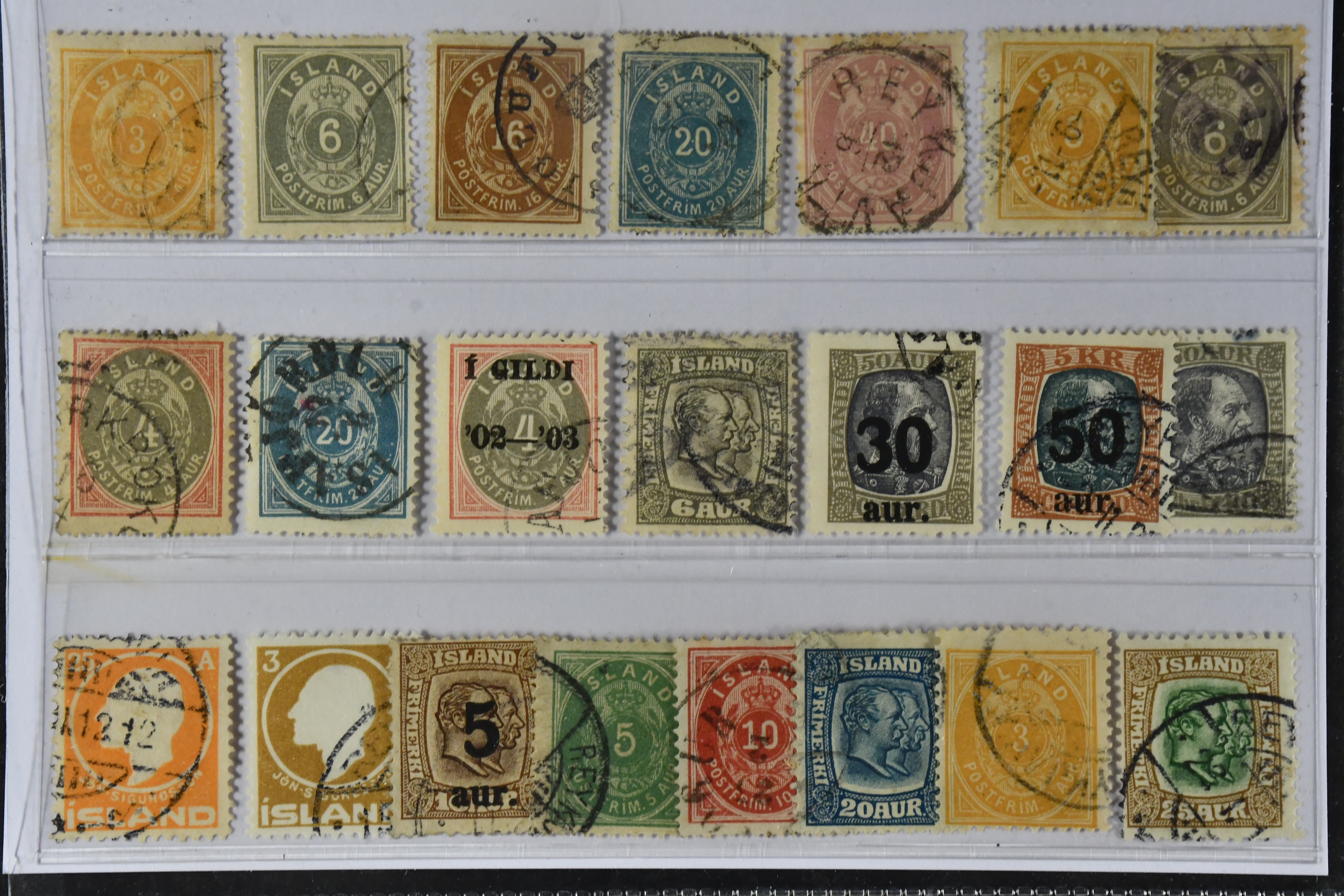 Iceland. Used 1876–1911. All different, e.g. F 8, 11, 13, 15, 17, 21-22, 28, 50, 95, 101-02, 113. Mostly good quality. F SEK 6105 (22)