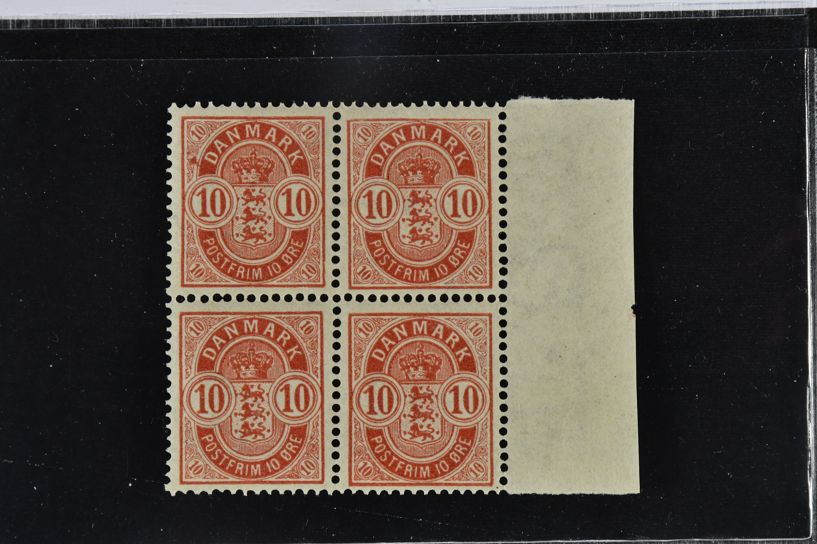 Denmark. Facit 54 ★★, 1885 Coat-of-Arms large figures 10 øre carmine, perf 14 × 13½. Block of four with right margin. SEK 3200