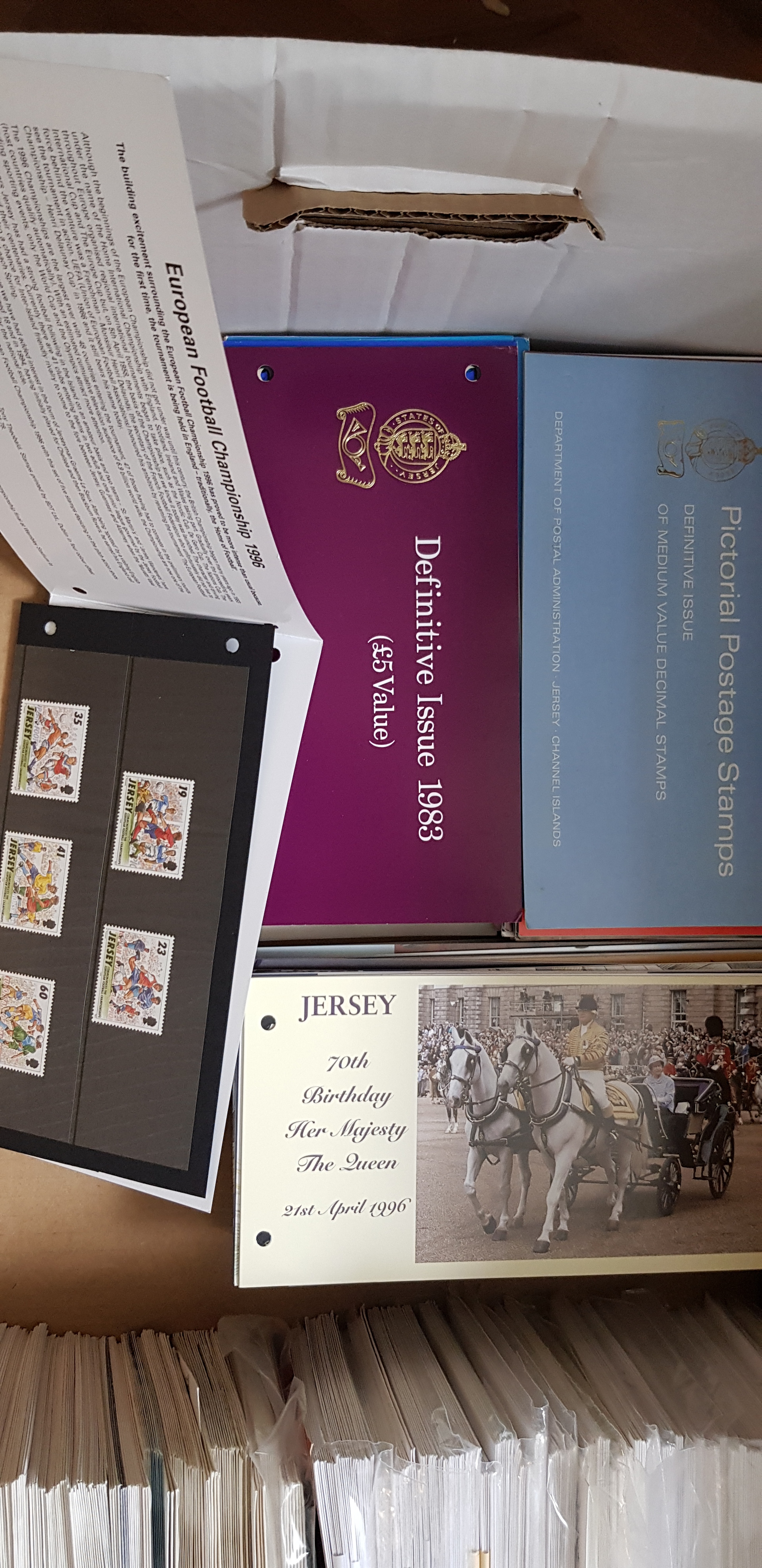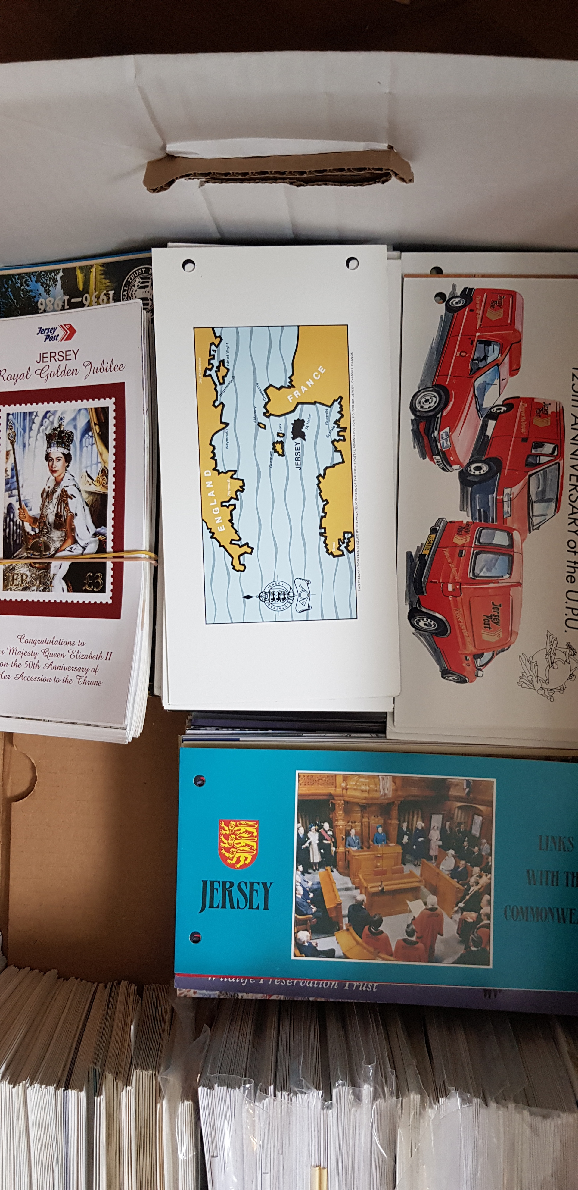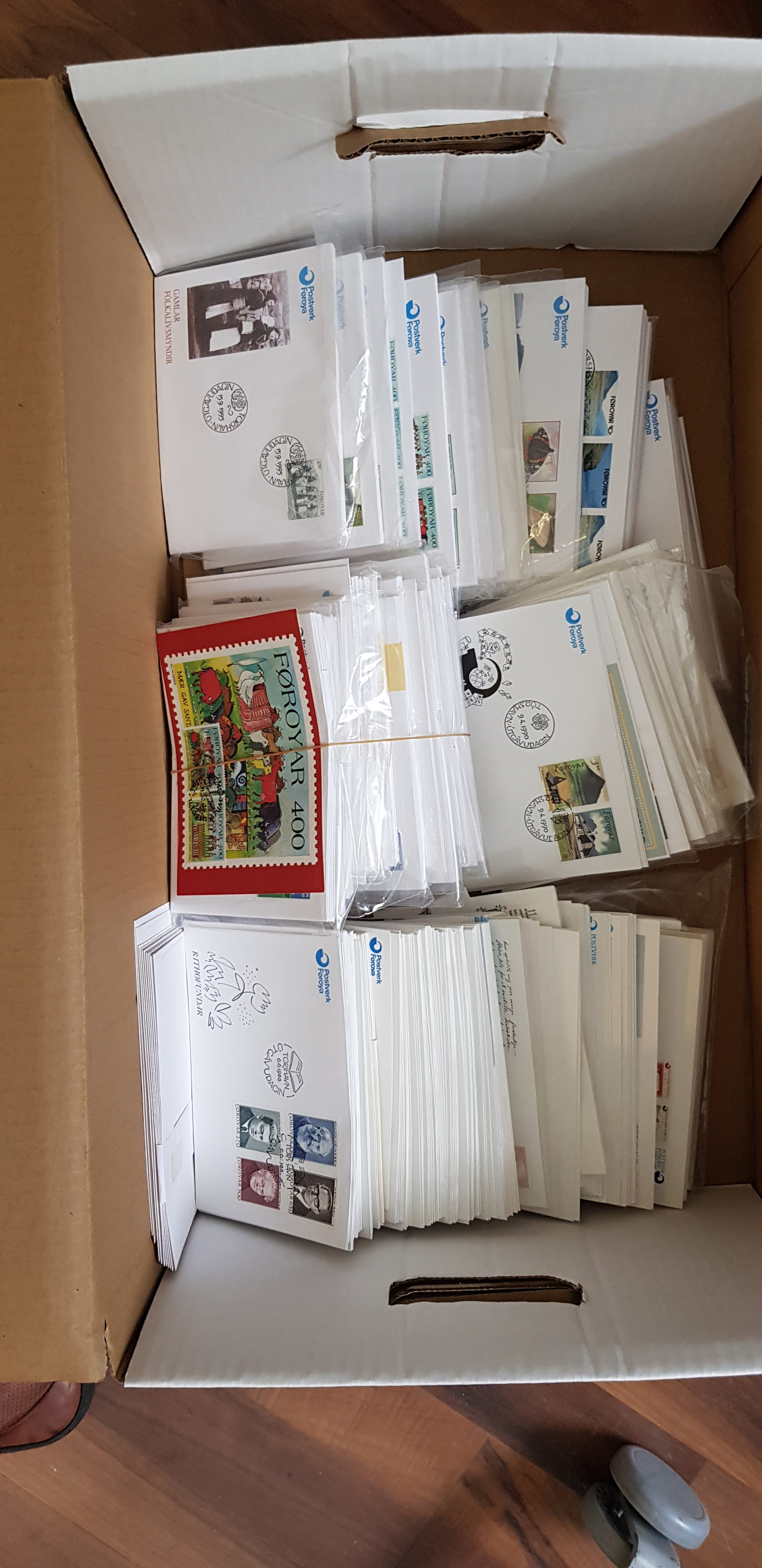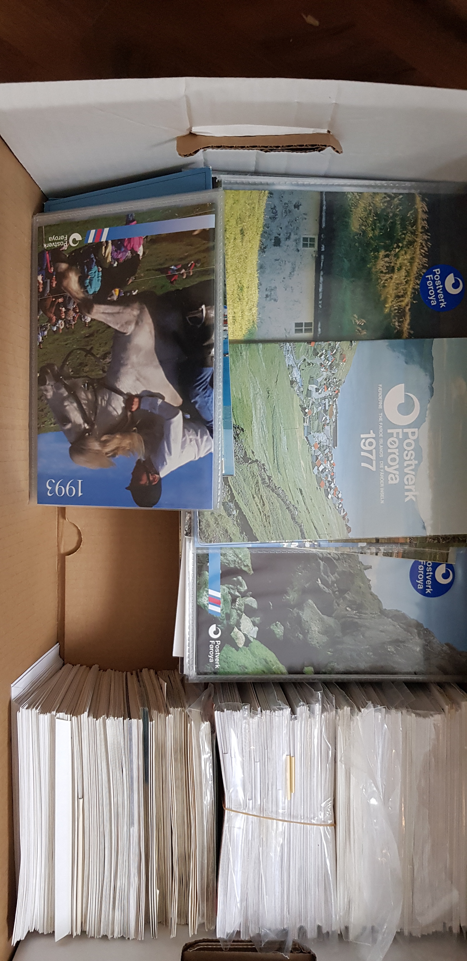 The Faroes. Collection/accumulation mostly ★★ 1900–2000 in box. One box including FDC from Faraoe Islands also a lot of yearsets, a lot of leaves from Jersey including unused stamps. Please see a selection of scans at www.philea.se. Fine quality. Approx. 11 kg.