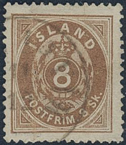 Iceland. Facit 3 used, 1873 Skilding values 8 sk brown, perf 14 × 13½. Reperforated space filler with small owner mark on reverse. SEK 10000