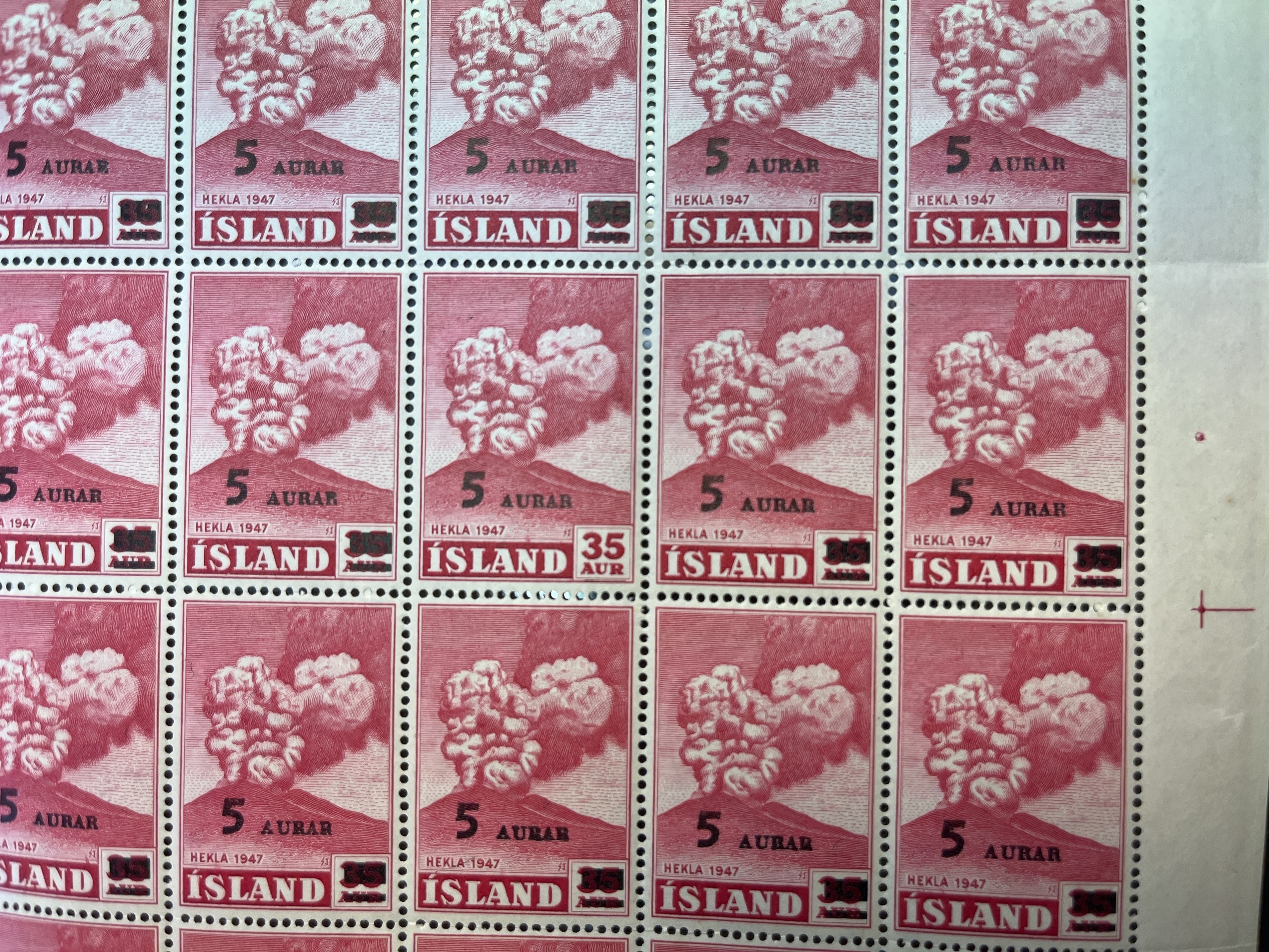 Iceland. Facit 326v2 ★★, 1954 Surcharge on Hekla 5/35 aur carmine bars missing (pos. 28). In full sheet. Edition ca. 500. SEK 1800