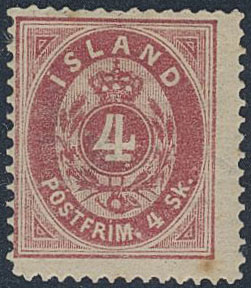 Iceland. Facit 2 ★, 1873 Skilding values 4 sk red, perf 14 × 13½. Almost off-centered. SEK 1500