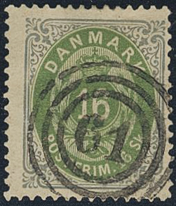 Denmark. Facit 24 used, 1870 Bi-coloured type perf 14 x 13½ 16 skill green and grey. Very fine numeral cancel 61. SEK 1600