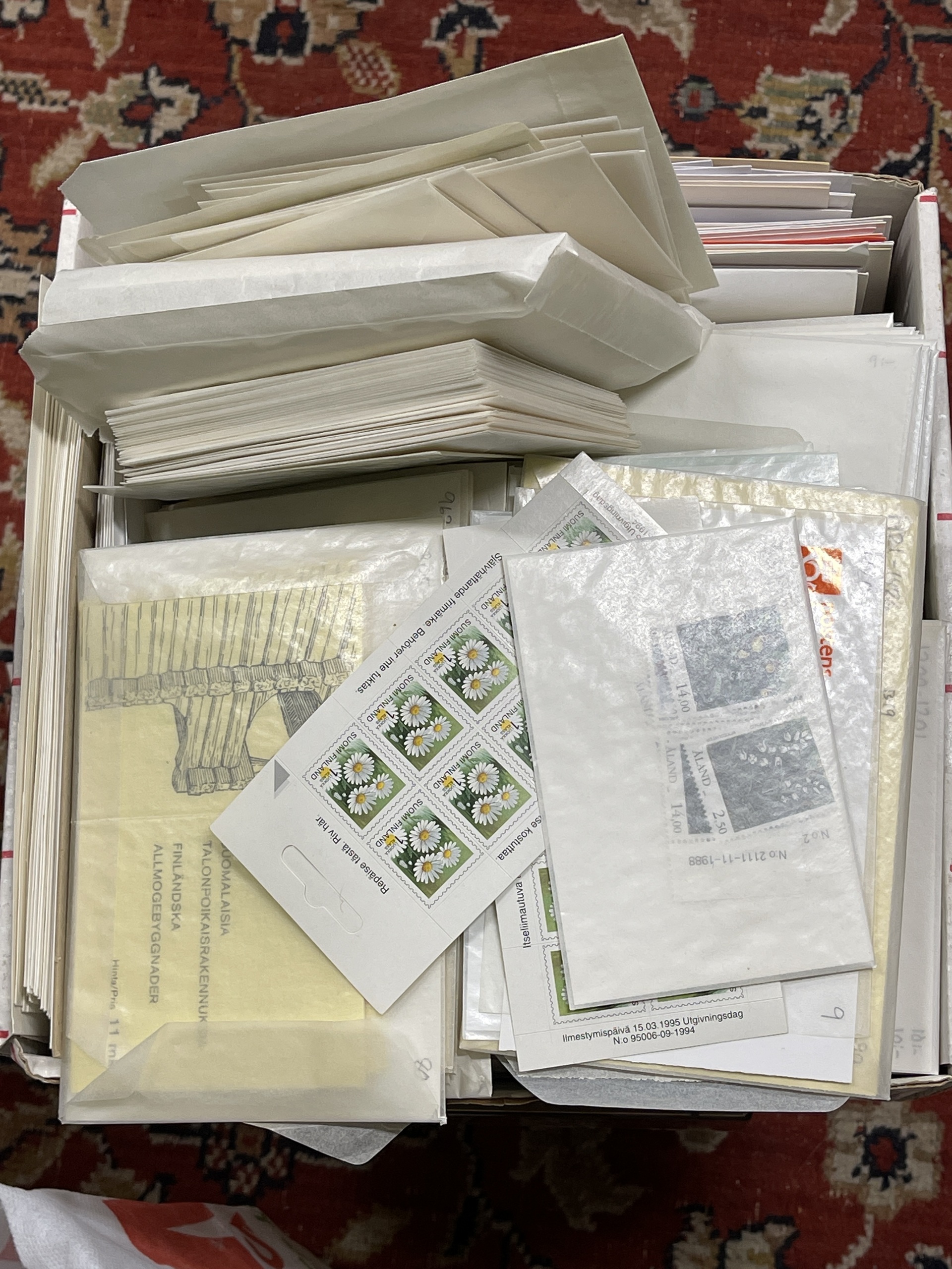 Finland. Lot ★★ 1970–2000:s. Also including Åland. Yearsets, booklets and envelopes. Face value 10000+. Lot of 1:class and 2:class stamps. Approx. 6 kg.