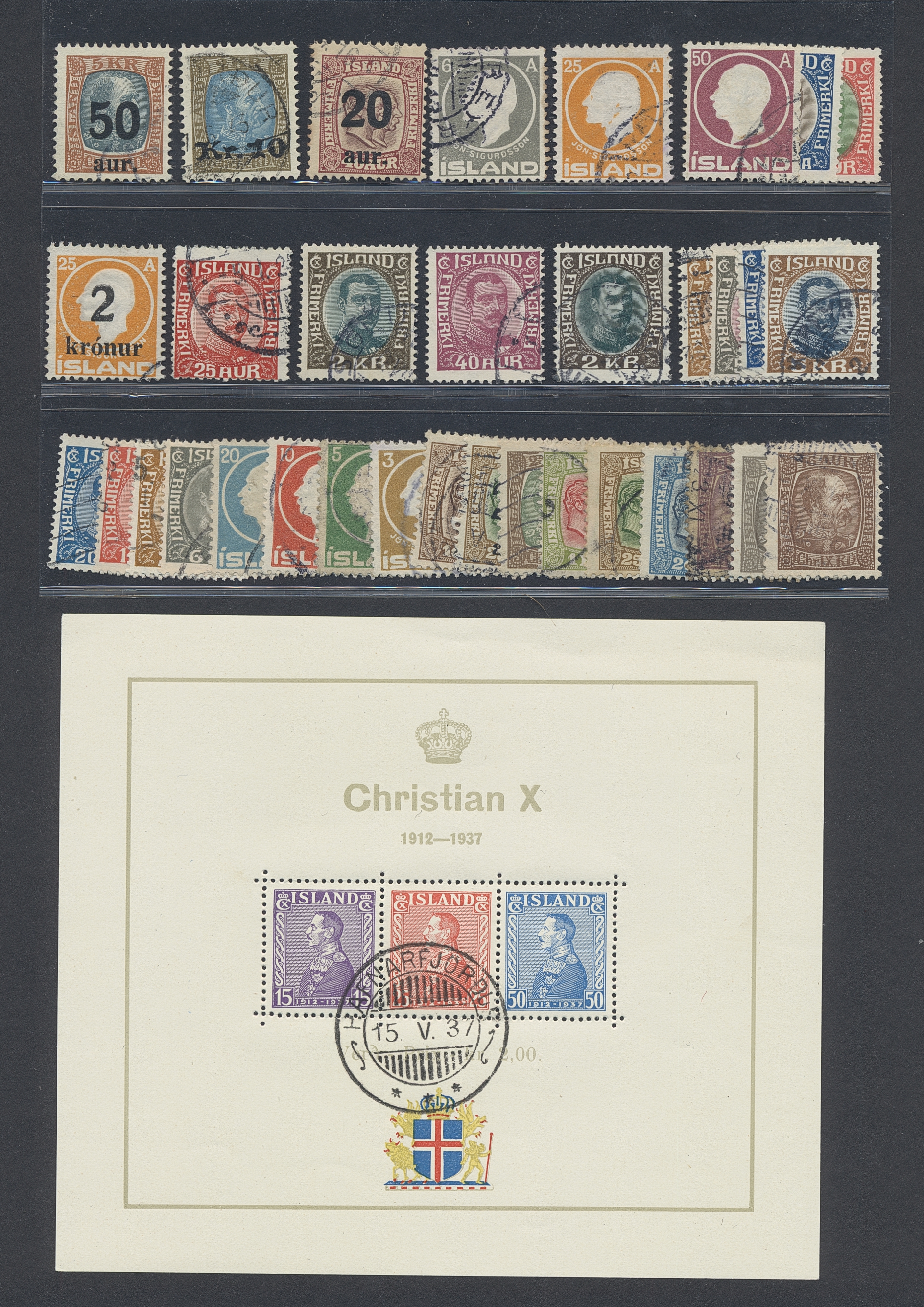 Iceland. Used 1902–38. All different, e.g. F 102-03, 106, 111, 113, 117, 121, 137, 143, 154, 156, Souv.sheet. Mostly good quality. F SEK 9.810 (36)