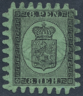 Finland. Facit 6 used, 1866 Coat-of-Arms Finnish values 8 p black on green paper. SEK 1500