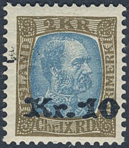 Iceland. Facit 103 ★★, 1929 Surcharge on Christian IX 10 Kr / 2 Kr blue/olive-brown. With an interesting black spot in left margin, probably smudged printing ink from the surcharge. SEK 2300