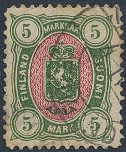 Finland. Facit 25 used, 1885 Coat of Arms m/75, new colours 5 Mk green/red. A bit unfresch. SEK 3500