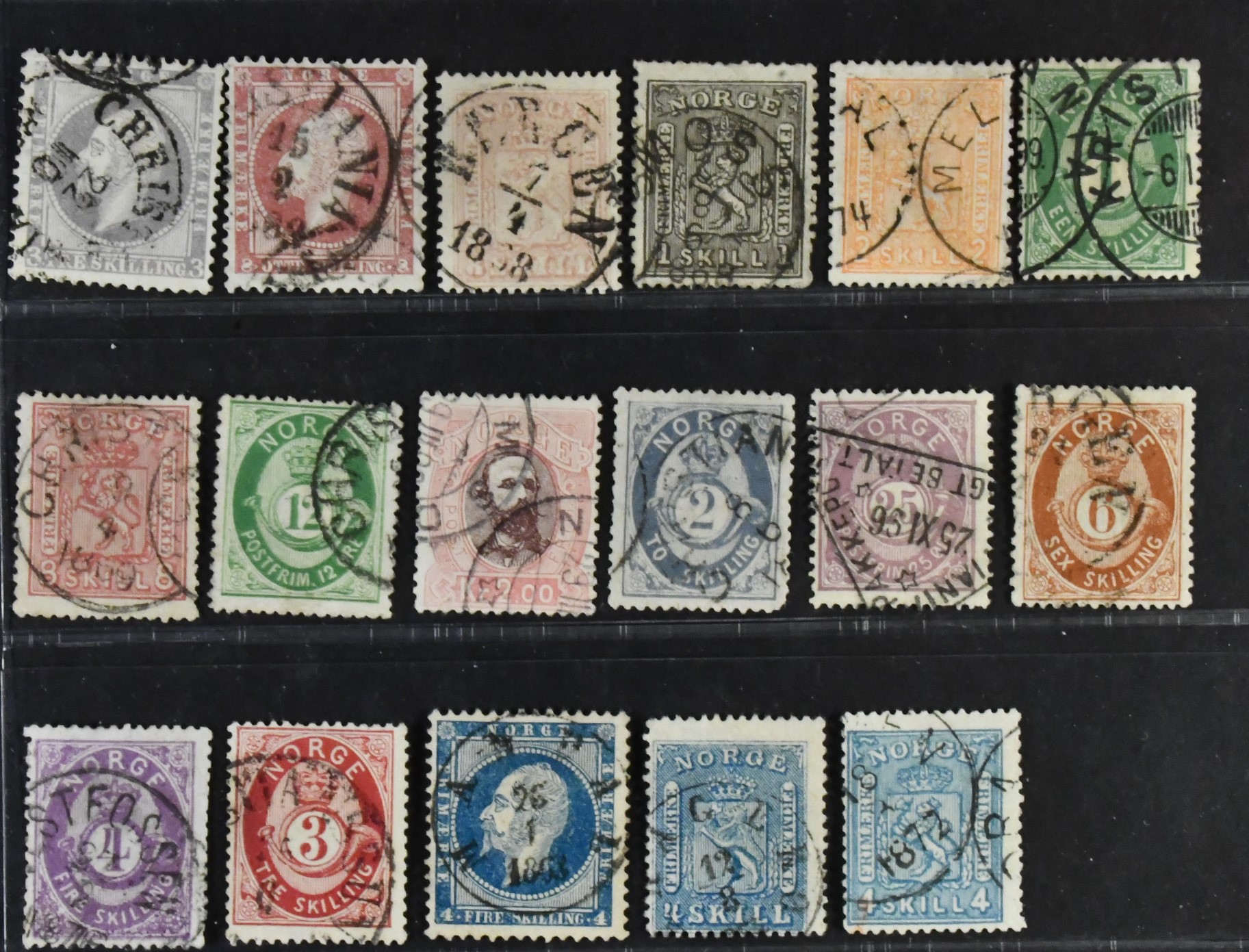 Norway. Used 1856–1878. All different, e.g. F 3, 5, 9, 11-12, 15-17, 19-20, 28, 30, 36. Mostly good quality. F SEK 7265 (17)