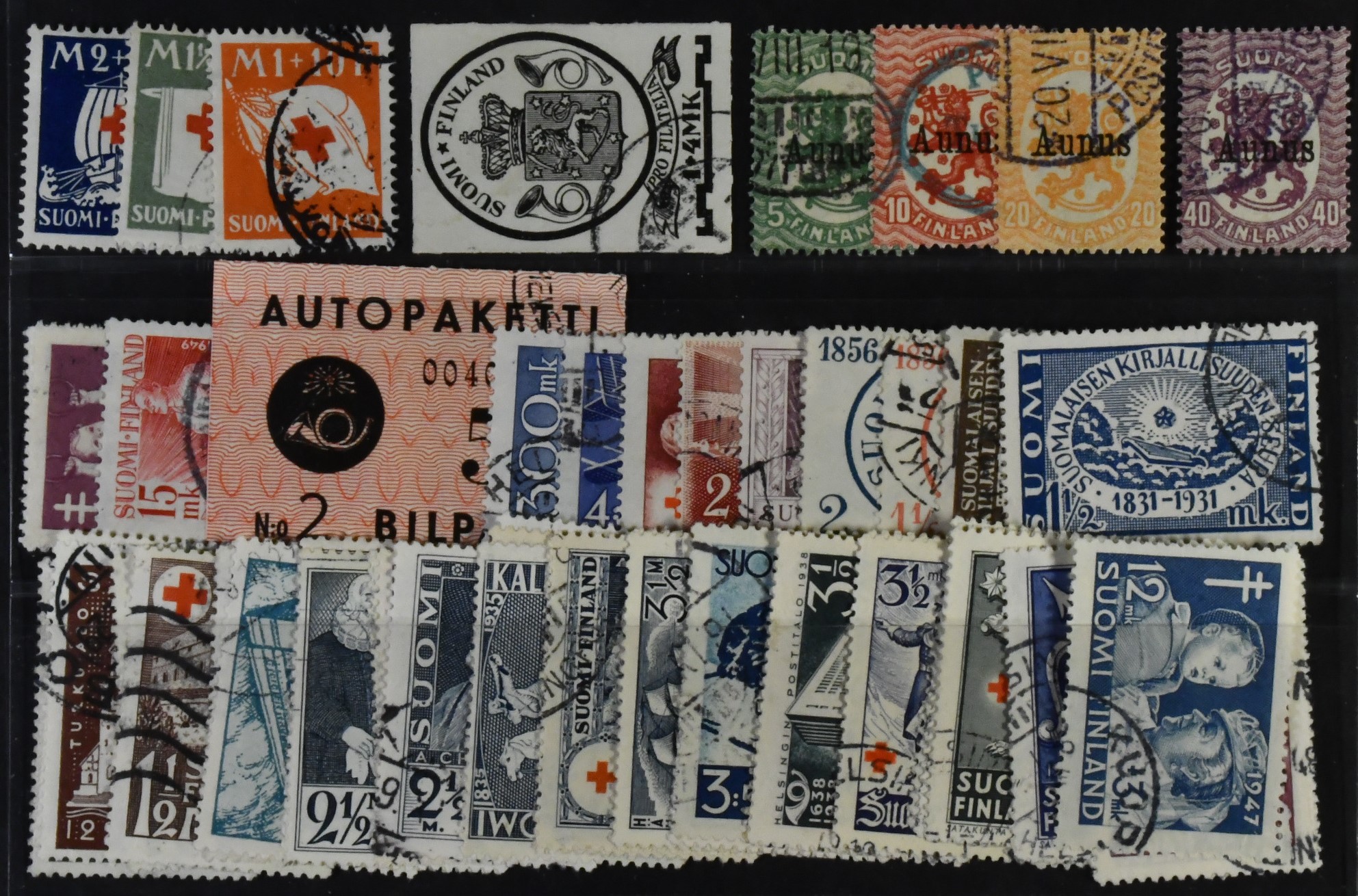 Finland. Used 1929–1950. All different, e.g. F 162-64, 168-70, 173, 177-79, 185-87, 212-14, BF2, Aunus 1-4. Mostly good quality. F SEK 5530 (67)