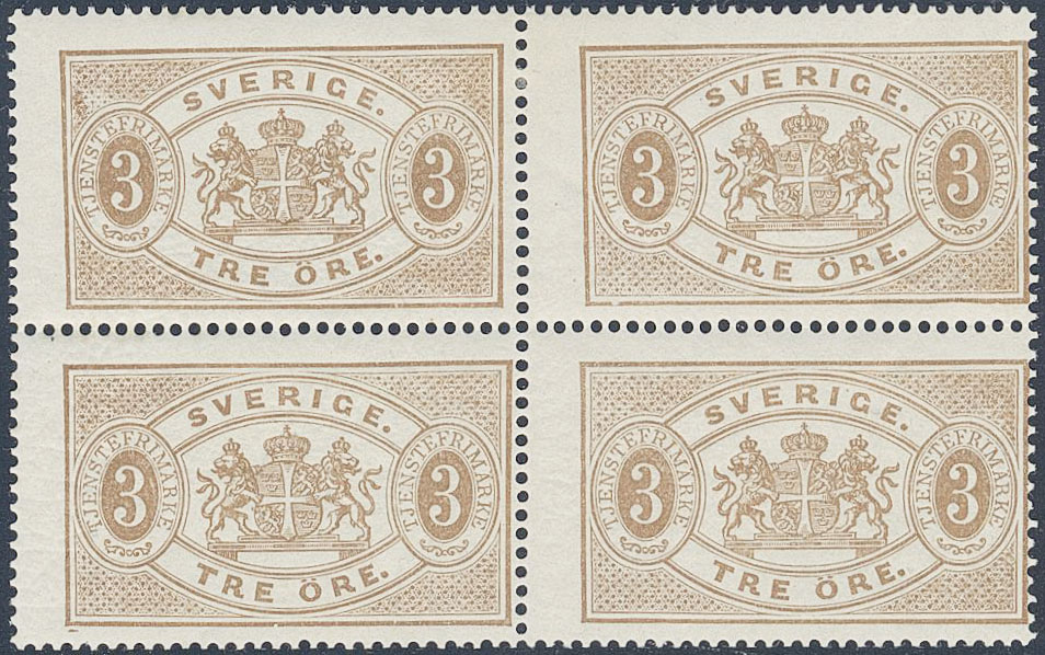 Sweden. Official Facit Tj1c ★★/★, 3 öre grey-brown, perf 14 in block of four. Two stamps mnh. SEK 6750+