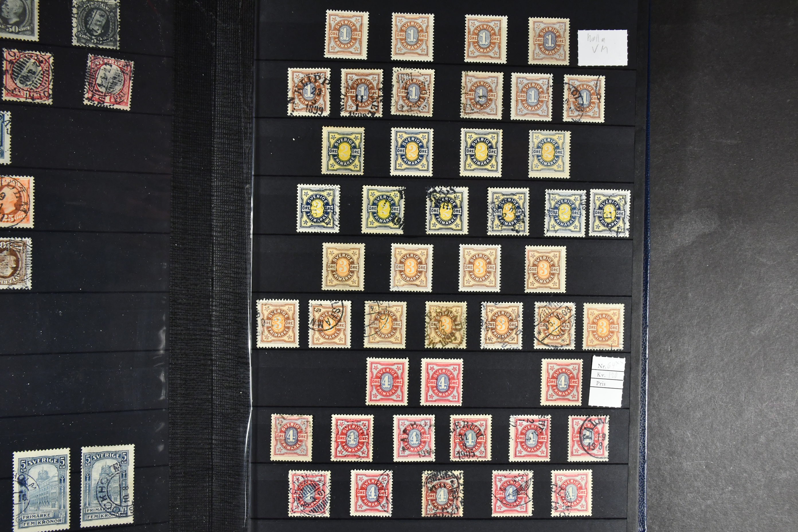 Sweden. Collection/accumulation mostly used 1855-1920 in stockbook. Many better stamps and e.g. shades, also some unused, very high catalogue value, the entire lot is presented at www.philea.se. Somewhat mixed quality.