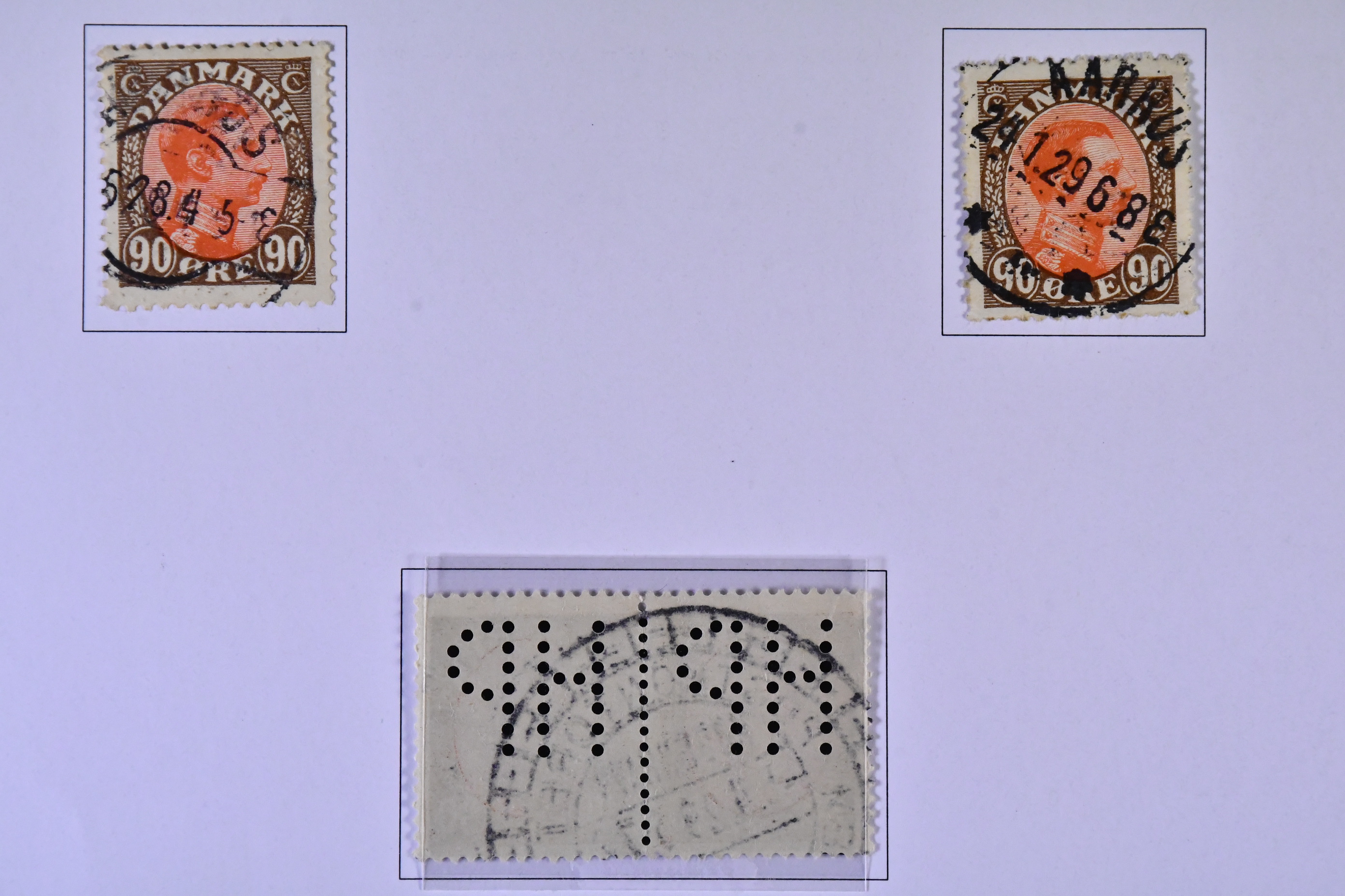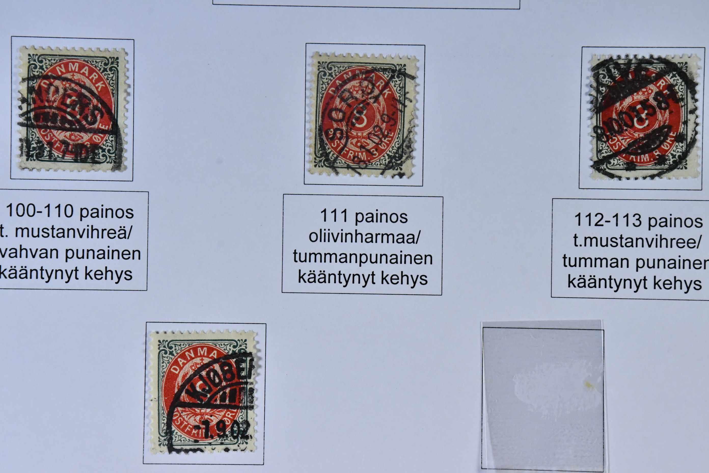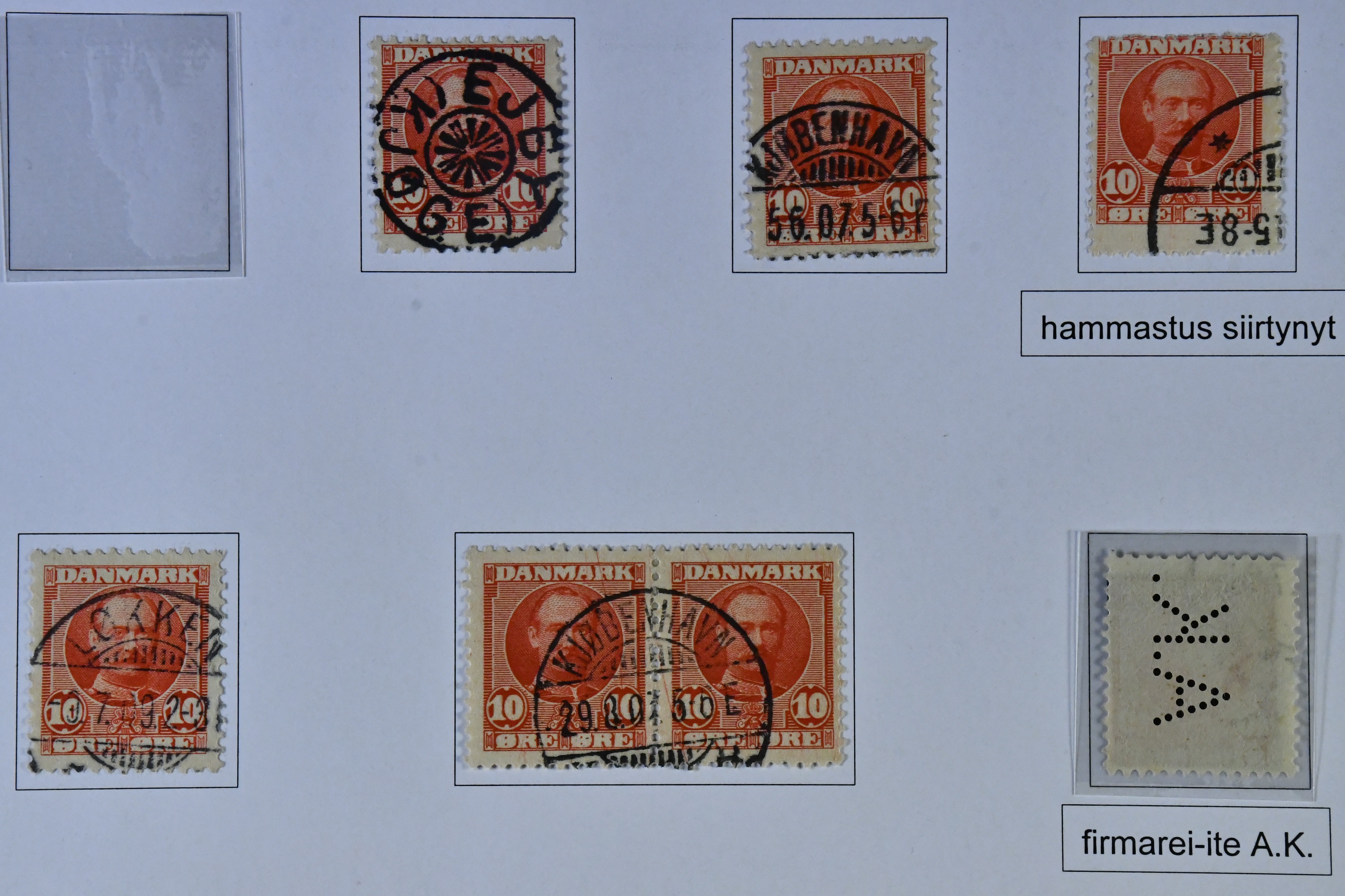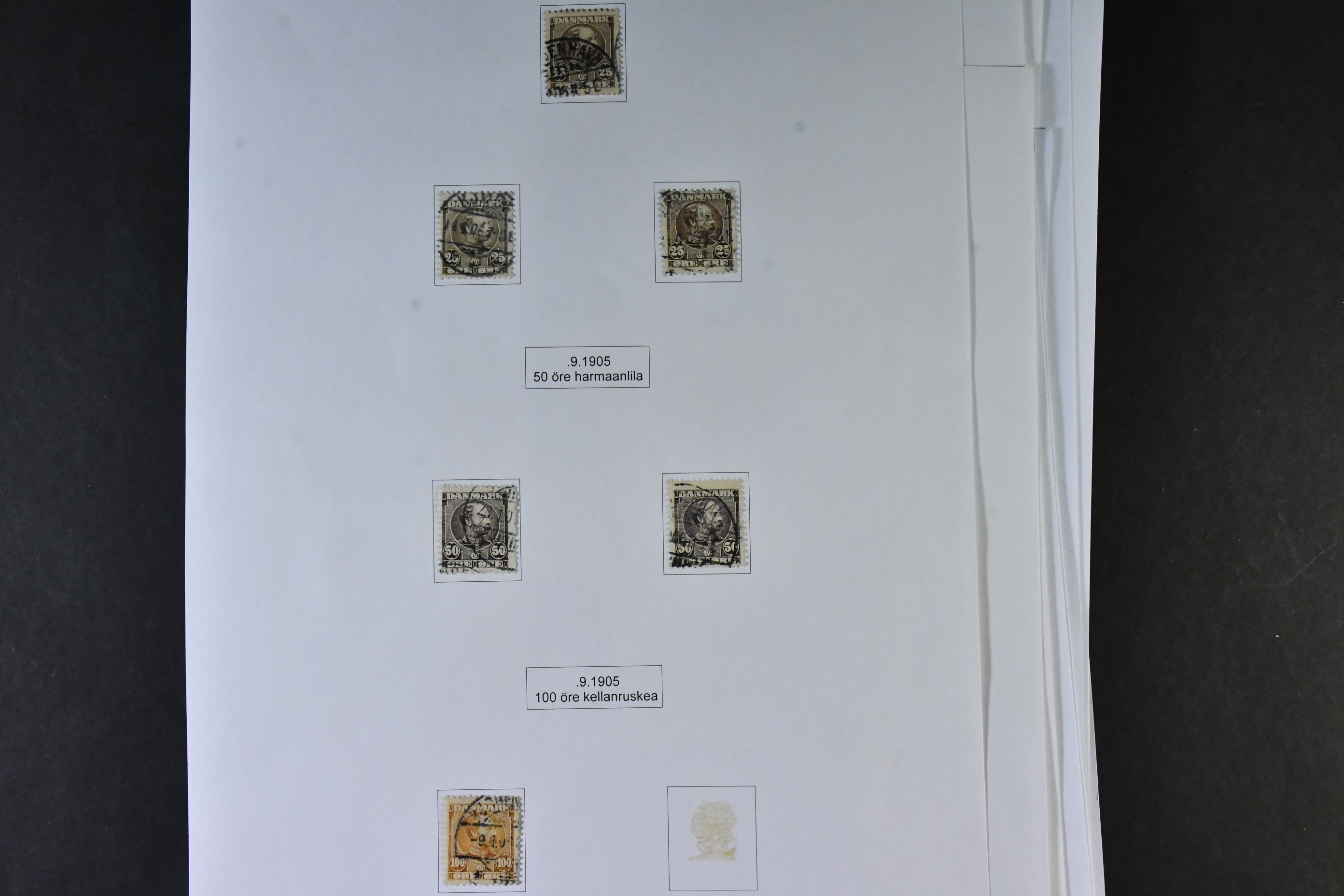 Denmark. Collection mostly used 1851-1940 on leaves. MOUNTED EXHIBITION COLLECTION (Finnish text) with covers removed but stamps present inclduing many better copies, e.g. large amount of Skillings, inverted frames, several 5kr GPO, overprinlt stamps, some unused etc, good oportunities to find shade, varieties etc! All important pages at www.philea.se, in addition about 40 apparently less important pages.